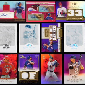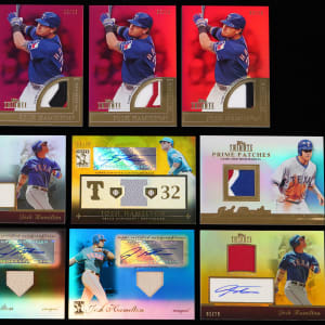 Eleven #1/1s! With an incredible batting eye that once notched a four-homer game and a Home Derby onslaught, the massively talented Josh Hamilton is profiled throughout the offered 2009-2012 Topps Tribute certified autograph, relic and parallel collection of (36) cards. Features a variety of color schemes and tiered subsets. Highlights include: