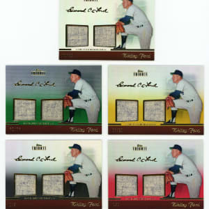 "The Chairman of the Board" deals with the offered 2011 Topps Tribute Whitey Ford dual relic complete rainbow set of five cards. The following color variants are present: #/99 base, #/75 green, #/20 gold, #/5 black and #1/1 red.