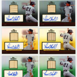 The clutch postseason performer comes up big with these eight 2011 Topps Tribute certified autograph/game-used relic cards. Includes: Pose One: (4 cards) with #/99 base, #/75 green, #/20 gold, #/5 black; Pose Two: (4 cards) with #/99 base, #/75 green, #/20 gold and #/5 red.