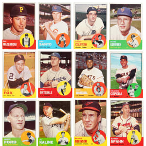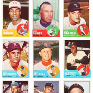Sparkling clean 1963 Topps near set of (493/576) cards with several Hall of Famers and stars. This crisp assembly has an approximate condition breakdown of 35% (EX-MT or better), 45% (EX) and 20% (VG-EX or lesser) with the tougher high series generally presenting on level with the more available numbers. The lower end of the condition spectrum is primarily due to factory errant centering common to the issue. Highlights include: #25 Kaline (EX-MT), #115 Yastrzemski (VG-EX), #120 Maris (EX), #135 Ashburn (EX-MT), #250 Musial (EX), #275 Mathews (EX-MT), #320 Spahn (EX), #345 B. Robinson (VG-EX), #360 Drysdale (VG), #380 Banks (VG-EX), #400 F. Robinson (EX), #440 Marichal (EX), #446 Ford (EX), #490 McCovey (VG-EX), #500 Killebrew (VG-EX), #520 Cepeda (EX), #525 Fox (EX) and #550 Snider (EX-MT).