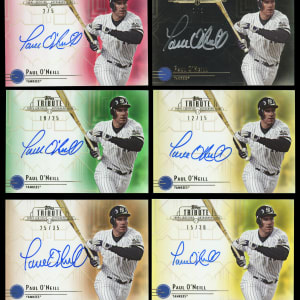 New York Yankees loyalists will appreciate the offered 2014 Topps Tribute Paul O'Neill certified autograph rainbow complete set of (10) cards. The following serially numbered color variations are present: #/99 base, #/50 blue, #/45 pink, #/40 orange, #/35 sepia, #/30 yellow, #/25 green, #/15 gold, #/5 red and #1/1 onyx. Missing only #1/1 purple for master set completion.