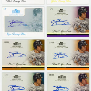 The speedy Brett Gardner of the New York Yankees carefully inked these eight 2012 Topps Tribute certified autograph cards. The following "on card" signature variants are included: #/99 base, #/50 blue, #/25 orange, #/15 gold, #1/1 purple and (3/4) #1/1 printing plates.
