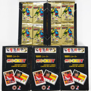 Supply has dwindled for these five 1990-1991 O-Pee-Chee Premier Hockey unopened wax boxes. Each unsearched container will deliver (36) 7-card packs. In addition to 132-card sets, find high-end rookies of Federov, Jagr, Modano, Mogilny, Nolan, Recchi, Roenick, Sundin and many more!