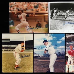 Hank Aaron, Mickey Mantle, Stan Musial, Reggie Jackson, Whitey Ford, Yogi Berra, Pete Rose, Eddie Mathews, Hank Bauer, Johnny Blanchard, Clete Boyer (“#6 W.S. Champs 1961”), Jim Coates, Ryne Duren, Bobby Richardson, Moose Skowron (“To John Best Wishes”), Gil McDougald, Brooks Robinson (“To John” on HOF Induction photo).