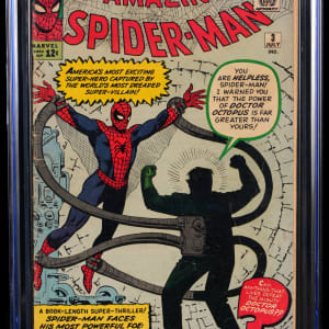 One of Marvel's greatest super-villains made his first appearance in this 7/63 Amazing Spider-Man #3 issue. This early Spider-Man saga introduced Dr. Otto Octavius, better known as Doctor Octopus. Linked to a quartet of mechanical arms by means of a brain-computer connection, Octavius fused with his deadly tentacles during a work explosion. As part of the fusion, the myopic mad scientist became telepathically linked to the tentacles, making him a dangerous win some-lose some match in his many battles with Spider-Man. As if he weren't deadly enough, Doc Ock founded the Sinister Six super-villain team to the great torment of your friendly neighborhood Spider-Man, and he is considered one of the best villains in the history of comic books. An important Silver Age key issue, the offered ASM #3 comic is encapsulated by CGC with a grade of 2.5, Off-White Pages. Label notes are "Stan Lee story, Steve Ditko cover and art. Origin and 1st appearance of Doctor Octopus (Otto Octavius). Human Torch appearance."