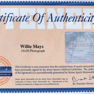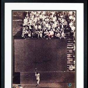 One of the greatest plays in the long history of Major League Baseball is commemorated, with this Willie Mays signed photograph. Known as “The Catch”, this thrilling defensive gem took place at the Polo Grounds, during Game 1 of the 1954 World Series. With the score tied in the eighth inning and two Cleveland Indians on base, the supremely talented Mays saved the New York Giants bacon, by tracking down a 420-foot blast to the deepest part of the field, off the bat of slugger Vic Wertz. Framed to overall dimensions of 21” x 25”, this 16” x 20” memorable moment photograph stops time just as Mays is about to make his celebrated over-the-shoulder snag. The Hall of Fame centerfielder has signed with (“9”) potency, an inch above his extended glove.