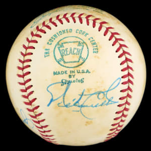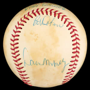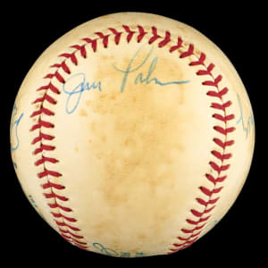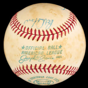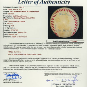 The 1971 AL Champion Baltimore Orioles had Hall of Fame hitters Frank and Brooks Robinson, but the strength of this team was their starting pitchers. Mike Cuellar, Pat Dobson and Jim Palmer each won 20 games that year, and Dave McNally won 21. This unique baseball signed by those 20-game winners is a toned OAL/Cronin ball with signatures averaging (“7-8”). While these occasionally hit the market as "reunion" examples, finding an original, period signed Cronin ball is exceptionally rare with this one being the first Huggins & Scott Auctions has offered. It is accompanied by a Full LOA from James Spence/JSA.