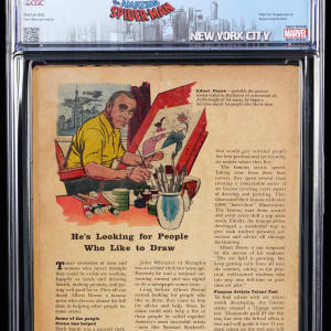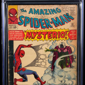 Everybody's favorite web-slinger faced a mysterious new menace, in this 6/64 Marvel Amazing Spider-Man #13 issue. Shrouded in plumes of smoke, super-villain Mysterio made his debut appearance in this prized Silver Age key issue. A master of special effects, Mysterio set Spidey on a course to clear his name, after framing the wall-crawling wonder-teen for a museum robbery in this intriguing tale. The appeal of Steve Ditko's captivating cover is amplified by several Stan Lee teasers, which made this classic comic an irresistible newsstand attraction for period readers. Recently returned from CGC with a grade of (3.0, Off-White to white Pages), this Silver Age treasure stacks up as a sweet prize. Label notes are "Stan Lee story, Steve Ditko cover and art. Origin and 1st appearance of Mysterio (Quentin Beck)."