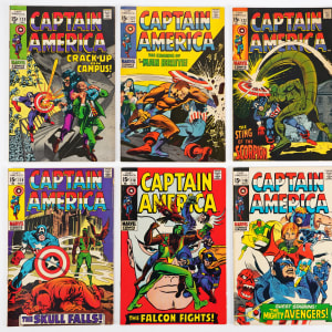 The Star Spangled Avenger saves the day, with this selection of (9) different 1969-1970 Marvel Captain America comic books. A hit with WWII readers during the Golden Age, Cap was thawed from the ice in the 1960s, and became one of the leaders of the mega-popular Avengers super-hero team. His Silver Age revival led to space sharing with Iron Man in Tales of Suspense, and ultimately his own solo title in 1968. These classic comics date from the early days of Cap's solo run, encompassing the period just before and after he teamed up with the Falcon for the first time, and the majority see him battling his demonic arch-enemy, the Red Skull. All issues are in pleasing condition, and the star attraction has just returned from CGC grading submission.