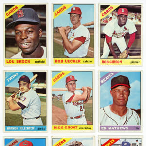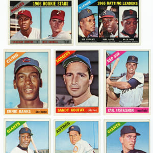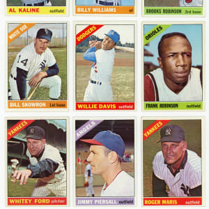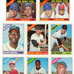 From the season in which the O’s swept the Dodgers four straight arrives this sweeping 1966 Topps complete set of 598 cards. This difficult-to-complete mixed grade edition has an approximate condition breakdown of 15% NM or better, 25% EX-MT, 35% EX and 25% VG-EX or lesser with the tougher high series generally presenting similarly, if not a touch better than the more available numbers. Highlights include: #1 Mays (GD), #30 Rose (VG), #50 Mantle (GD), #70 Yastrzemski (EX-MT), #91 Uecker (VG, No Trade Statement), #100 Koufax (GD), #103 Groat (VG-EX, No Trade Statement), #110 Banks (VG-EX), #120 Killebrew (NM), #125 Brock (NM), #126 Palmer RC (EX), #160 Ford (EX-MT), #200 Mathews (NM), #215 N.L. Batting Leaders (EX-MT), #254 Jenkins RC (VG), #288 Sutton RC (EX), #300 Clemente (VG), #310 F. Robinson (EX), #320 Gibson (EX-MT), #365 Maris (VG-EX), #390 B. Robinson (EX-MT), #410 Kaline (EX), #469 Murcer RC (EX), #500 Aaron (EX), #526 Twins Team (GD), #530 Roberts (NM), #535 W. Davis (EX), #540 McLain (FR), #547 H. Clarke RC (PR, cut), #550 McCovey (EX-MT), #565 Piersall (EX), #567 Howser (EX-MT), #580 B. Williams (EX-MT), #583 Tigers Team (VG), #590 Skowron (EX), #591 G. Jackson RC (VG) and #598 Perry SP (GD).