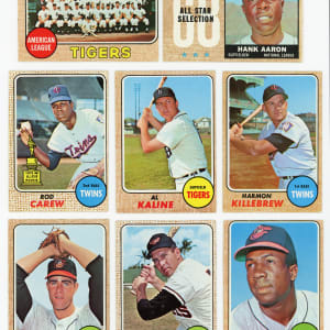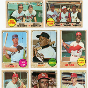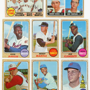 Formidable 1968 Topps near complete set of 597/598 cards. This burlap bordered edition has an overall approximate condition breakdown of 20% EX or better, 25% VG-EX, 35% VG and 20% GD or lesser. Highlights include: #1 Clemente/Alou LL (VG), #3 Clemente/Aaron LL (PR, reverse writing), #20 B. Robinson (GD), #45 Seaver (VG), #50 Mays (FR), #58 Mathews (VG), #80 Carew (GD), #100 Gibson (GD), #110 Aaron (VG-EX), #150 Clemente (VG-EX), #220 Killebrew (VG-EX), #230 Rose (VG), #240 Kaline (VG), #247 Bench RC (VG), #250 Yastrzemski (VG), #280 Mantle (VG), #330 Maris (GD), #355 Banks (VG-EX), #370 Aaron AS (VG-EX), #374 Clemente AS (VG), #408 Carlton (VG-EX), #480 Managers’ Dream/Clemente (GD), #490 Super Stars Mantle/Mays (VG), #500 F. Robinson (GD), #520 Brock (GD), #528 Tigers Team (GD), #530 Bird Belters/Robinsons (GD) and #575 Palmer (VG-EX). Missing only #177 Ryan RC (available elsewhere as a separate lot in this auction) for completion.