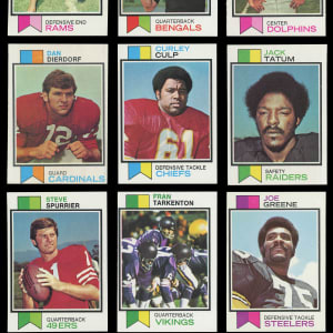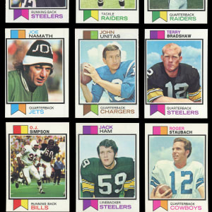 Human highlight reels are showcased throughout the offered 1973 Topps Football complete set plus the 26-card Team Checklist set (all neatly marked). This upper tier 528-card edition generally averages (EX-MT) condition with some better and others lesser being primarily due to factory errant centering. Keys include: #15 Bradshaw (VG-EX), #34 K. Anderson RC (VG-EX), #60 Tarkenton (EX), #77 Shell RC (EX-MT), #89 F. Harris RC (EX-MT), #115 Ham RC (EX-MT), #167 Culp RC (EX-MT), #280 Greene (EX-MT), #288 Tatum RC (EX-MT), #322 Dierdorf RC (VG-EX), #341 Langer RC (EX-MT), #343 Youngblood RC (VG-EX), #400 Namath (EX), #455 Unitas (EX-MT), #475 Staubach (EX-MT), #481 Spurrier (EX-MT), #487 Stabler RC (EX-MT) and #500 Simpson (EX-MT).