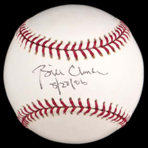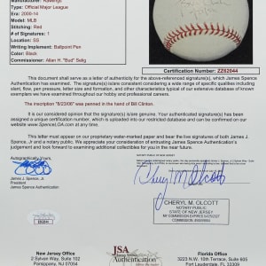 42nd President Bill Clinton enjoyed high approval ratings during his two terms in office. Here's your chance to approve of him once again, by acquiring this Clinton single-signed and dated baseball. Clinton has signed with ("7.5") potency on the sweet spot of this bright, clean OML/Selig baseball, and he has included the date inscription "8/23/06". At the time of this signing, Clinton was engaged in admirable endeavors, addressing issues such as public health, poverty, and climate risks, among others.