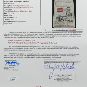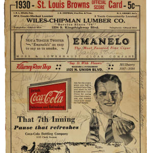 Connie Mack's last great dynasty is remembered with this 1930 Philadelphia Athletics team-signed St. Louis Browns scorecard. The A's were in the midst of a three-year run of consecutive World Series berths that saw them win championships in 1929 and 1930. This antique scorecard (FR) is a worthy relic of this long ago monster squad, which was loaded with Hall of Famers and star players. The addition of 17 signatures on the front cover makes this ancient game-day relic infinitely more important, especially considering that all of the signers passed away decades ago.