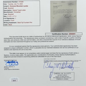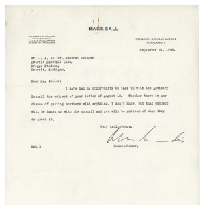 When owners were embarrassed by the “Black Sox” World Series scandal, they turned to Federal Judge Kenesaw Mountain Landis to serve as commissioner and resolve the issue. He expelled eight members of the Chicago White Sox for conspiring to lose the 1919 World Series. Whether you agreed with his decisions or not, he ruled over baseball with an iron hand for nearly a quarter century and is credited with restoring public confidence in the game. This letter, in Excellent condition, on the stationery of the Commissioner of Baseball, is typewritten and addressed to Mr. J.A. Zeller, General Manager, Detroit Baseball Club, Briggs Stadium, Detroit, MI. The long flowing signature grades ("8-9").