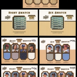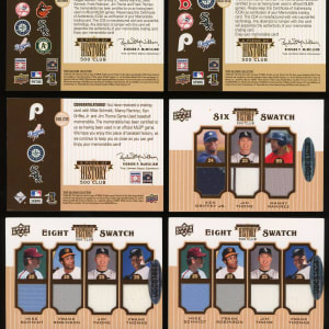 Each serially numbered to #/25 or lesser. Only members of the exclusive 500 Home Run Club are found with these (5) 2009 Upper Deck Ballpark Collection A Piece of History multi-swatch relic cards. A total of (30) game-used bat/uniform pieces are present! Includes: Eight-Swatch: (2 cards, both #/25 and double-sided, one has COA) with (2) T. Williams/R. Jackson/Griffey Jr./M. Ramirez (front) and Schmidt/F. Robinson/Thomas/F. Thomas (back); Six-Swatch: (#/15, double-sided with COA) with T. Williams/R. Jackson/Schmidt (front) and Griffey Jr./Thome/M. Ramirez (back); Quad-Swatch: (2 cards, both #/15) with Schmidt/M. Ramirez/Griffey Jr./Thome and Schmidt/M. Ramirez/R. Jackson/F. Robinson.
