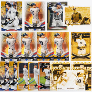 Each serially numbered #/49 or lesser. All rise for the offered 2017-2021 Topps Aaron Judge 5x7 collection of (17) cards including rookies. The following oversized photos of the hulking New York Yankees slugger are included: (5) 2017 Topps Tribute ((2) #/10, (3) #/49), (2) 2018 Topps Tribute #39 (#/10, #/49), 2019 Topps #6 Historic Through-Lines with Babe Ruth (#/10), (3) 2019 Topps Tribute #75 (all #/10), (2) 2020 Topps #7 (both #/10), 2020 Topps Tribute #24 (#/10) and (3) 2021 Topps #99 (all #/10, different poses).
