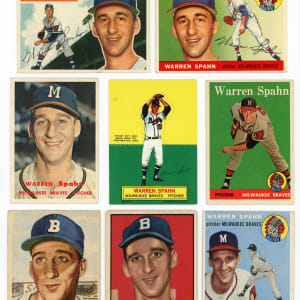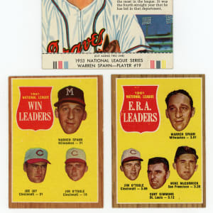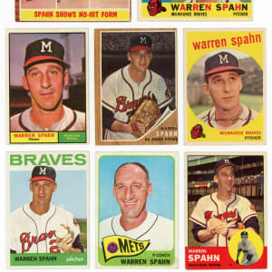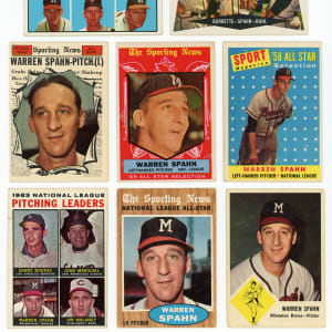 Milwaukee Braves Hall of Fame southpaw Warren Spahn is captured throughout the prime of his legendary career with these (27) different cards. Includes: Topps Spahn: (25 cards) with 1952 #33 (GD, bb), 1953 #147 (VG), 1954 #20 (VG-EX), 1955 #31 (VG), 1956 #10 (EX-MT), 1957 #90 (VG-EX), 1958: (2 cards) with #270 (GD), #494 AS (VG); 1959: (2 cards) with #40 ( VG), #571 AS (VG); 1960: (2 cards) with #230 Burnett/Spahn/Buhl (VG-EX), #445 (GD); 1961 Topps: (3 cards) with #47 LL (VG-EX), #200 (VG-EX), #589 AS (VG-EX); 1962: (5 cards) with #56 LL (VG-EX), #58 LL (EX), #100 (VG), #312 Shows No-Hit Form (GD), #399 AS (VG); 1963 #320 (VG), 1964: (2 cards) with #3 LL with Koufax/Marichal (VG-EX), #400 (EX); 1964 Stand-Ups SP (EX), 1965 #205 (EX); Non-Topps Spahn: (2 cards) with 1953 Red Man Tobacco #19 (VG, with tab) and 1963 Fleer #45 (GD).