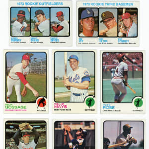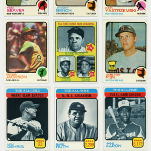Razor-sharp 1973 Topps complete set of 660 cards! This crystal-clear edition has an overall approximate condition breakdown of 20% NM-MT or better, 45% NM and 35% EX-MT or lesser with the lower end of the condition spectrum being primarily due to factory errant centering. Highlights include: #1 Ruth/Aaron/Mays (EX), #50 Clemente (NM-MT), #100 Aaron (NM-MT), #130 Rose (EX-MT), #174 Gossage RC (NM), #193 Fisk (EX-MT), #220 Ryan (NM), #245 Yastrzemski (EX-MT), #255 R. Jackson (NM), #305 Mays (NM), #350 Seaver (EX-MT), #380 Bench (EX), #472 Gehrig LDR (NM), #473 Aaron LDR (EX), #474 Ruth LDR (NM), #588 CL (marked), #613 Boone RC (EX-MT), #614 Bumbry/Evans RC (NM) and #615 Schmidt RC (EX-MT).