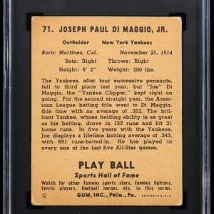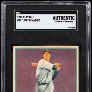 Graded Authentic by SGC due to evidence of trimming. From his record-setting campaign arrives the offered 1941 Play Ball #71 Joe DiMaggio high number. Despite the unfortunate perimeter modification, this "Yankee Clipper" is otherwise crease-free and bolstered by a perfectly contrasted batting pose that pops from the tri-color background setting. The reverse, which details DiMaggio's batting exploits, is problem-free.