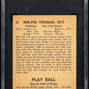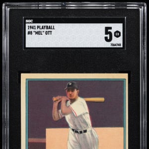 Graded EX 5 by SGC. "Polo Grounds" hero Mel Ott follows through on this crisp 1941 Play Ball #5 example. The 500 Home Run Club slugger has survived the decades in fine condition with mostly sharp corners, bright white edges and penetrating surface colors. New York Giants Hall of Famer.
