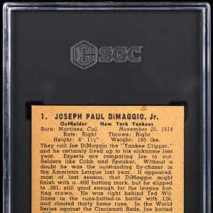 Graded Authentic by SGC due to evidence of trimming. Who better to lead off the storied 1940 Play Ball edition than "The Yankee Clipper?" The offered #1 Joe DiMaggio portrays the New York Yankees Hall of Fame great as he follows through on his patented swing.