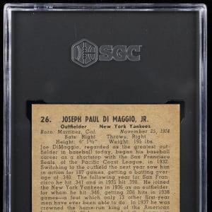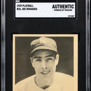 Graded Authentic by SGC due to evidence of trimming. Thrilling 1939 Play Ball #26 Joe DiMaggio portrait. With exception to the perimeter alteration, this classic black-and-white pose is otherwise crease-free with crisp player registration, creamy edges and a clean biographical reverse. A fine original of this early "Joltin' Joe!" New York Yankees Hall of Famer.