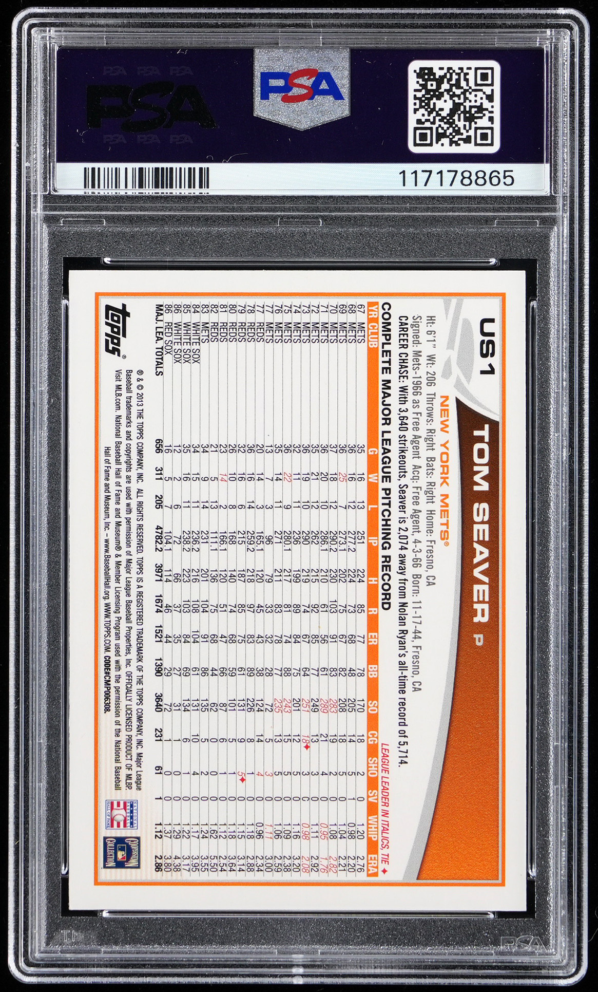 Graded GEM MINT 10 by PSA. Legends variation of New York Mets Hall of Fame pitcher Tom Seaver. Only 9 total copies have been validated by the authenticator.