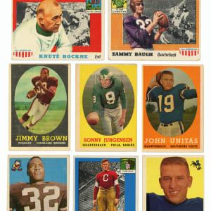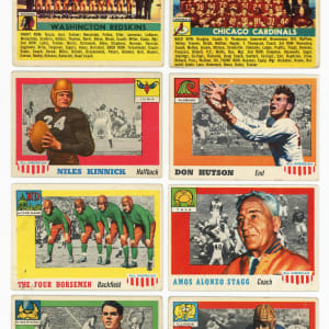1955 Topps All-American set: (100/100 complete set, average GD) with#1 Hickman RC (GD), #6 Kinnick RC (FR), #12 Graham (GD), #16 Rockne (GD), #20 Baugh (FR), #21 W. White RC (GD), #24 Strong (VG), #27 Grange (FR), #28 Hein RC SP (PR, reverse paper loss), #29 Nomellini SP (GD), #34 O’Brien RC (VG-EX), #35 Harmon RC SP (PR), #36 Edwards SP (GD), #37 Thorpe (VG), #38 Stagg RC (GD), #52 Lujack (FR), #56 Nevers RC (GD), #59 Blanchard RC (FR), #68 Four Horsemen RC SP (PR, reverse paper loss), #84 Parker RC SP (GD), #85 Luckman (FR), #97 Hutson RC SP (GD), #98 Feathers RC SP (VG), #100 Henry RC SP (PR, writing);