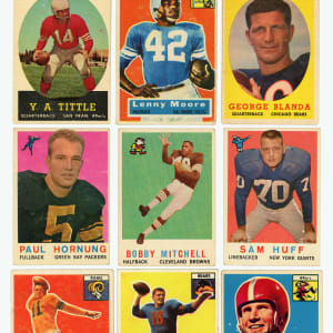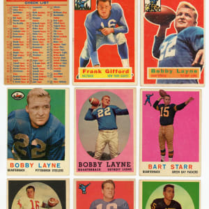 1959 Topps set: (176/176 complete set, average VG) with#1 Unitas (VG), #4 McGee RC (EX), #10 J. Brown (GD), #20 Gifford (GD), #23 Starr (GD), #40 Layne (VG), #51 Huff RC (GD), #82 Hornung (GD), #103 Karras RC (GD), #116 Kramer RC (FR), #130 Tittle (GD), #132 J. Parker RC (FR, stain), #140 B. Mitchell RC (VG), #155 J. Taylor RC (GD).