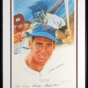 21” x 28” display with 16” x 24” limited-edition art print, also signed and numbered “520/521” by artist Cliff Spohn. In addition to his bold signature, Williams has filled the details at bottom of this commemorative print, with Home Run No. “520,” Date “9/17/60,” Opponent “Washington,” and Park “Griffith Stadium.”