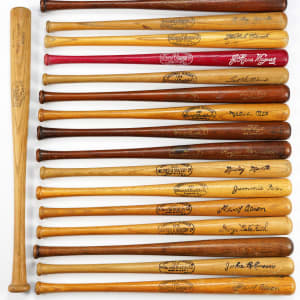 Louisville Slugger still makes mini-bats and and custom mini-bats, often given to kids as a reward, and they have been making them for a century. The mini-bats in this group range from 15 to 18 inches, and although it includes some modern mini-bats, most of them are from the period of the player with their facsimile signature on the barrel. They average EX to EX-MT condition with some better and some lesser. The barrels are embossed by veritable plethora of Hall of Famers and stars. Some of the highlights are: