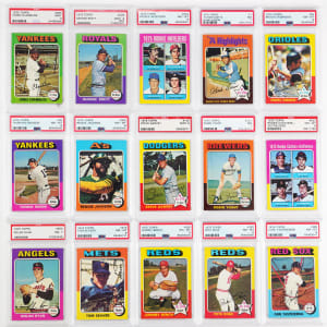 Radiant 1975 Topps complete set of 660 cards featuring 55 crisp PSA graded key cards. This razor-sharp assembly is highlighted by the following: