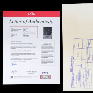 The large black and white New York Yankees Type I photographs are desirable for a few important reasons. The size and clarity of each Mickey Mantle and/or Roger Maris photo taken during 1960 season are rarely seen in this oversized format. From a three-game Yankees/Boston regular season series at Fenway Park from 9/23 to 9/25. Notable LIFE magazine photographer, Ted Polumbaum, captures the two Yankee sluggers both before and during games, with some in-action images. The official bold stamping on the reverse includes photographer name, date of game and the Yankees opponent. PSA/DNA Type I Photo Letter of Authenticity accompanies each lot.