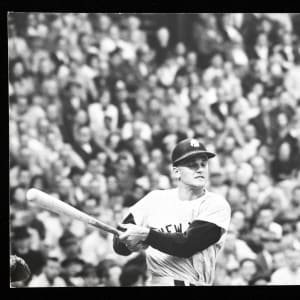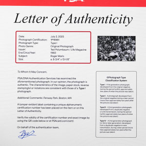 The large black and white New York Yankees Type I photographs are desirable for a few important reasons. The size and clarity of each Mickey Mantle and/or Roger Maris photo taken during 1960 season are rarely seen in this oversized format. From a three-game Yankees/Boston regular season series at Fenway Park from 9/23 to 9/25. Notable LIFE magazine photographer, Ted Polumbaum, captures the two Yankee sluggers both before and during games, with some in-action images. The official bold stamping on the reverse includes photographer name, date of game and the Yankees opponent. PSA/DNA Type I Photo Letter of Authenticity accompanies each lot.