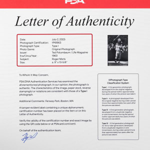 The large black and white New York Yankees Type I photographs are desirable for a few important reasons. The size and clarity of each Mickey Mantle and/or Roger Maris photo taken during 1960 season are rarely seen in this oversized format. From a three-game Yankees/Boston regular season series at Fenway Park from 9/23 to 9/25. Notable LIFE magazine photographer, Ted Polumbaum, captures the two Yankee sluggers both before and during games, with some in-action images. The official bold stamping on the reverse includes photographer name, date of game and the Yankees opponent. PSA/DNA Type I Photo Letter of Authenticity accompanies each lot.