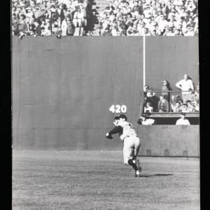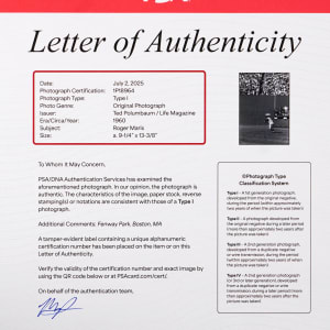 The large black and white New York Yankees Type I photographs are desirable for a few important reasons. The size and clarity of each Mickey Mantle and/or Roger Maris photo taken during 1960 season are rarely seen in this oversized format. From a three-game Yankees/Boston regular season series at Fenway Park from 9/23 to 9/25. Notable LIFE magazine photographer, Ted Polumbaum, captures the two Yankee sluggers both before and during games, with some in-action images. The official bold stamping on the reverse includes photographer name, date of game and the Yankees opponent. PSA/DNA Type I Photo Letter of Authenticity accompanies each lot.