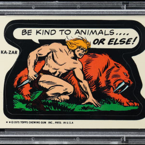 Marvel Comic's answer to Tarzan makes an impressive appearance, with this 1975 Topps Comic Book Heroes Ka-Zar sticker. The self-proclaimed "Lord of the Savage Land" is accompanied by his ferocious, faithful companion Zabu the saber-toothed cat on this well-preserved sticker, which has earned a (GEM MINT 10) grade from PSA. This lofty rating makes this pack-fresh example of "1 of 13" at the 10 level on PSA's Pop Report, out of a total population of 119.