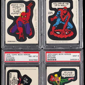 A Marvel-ous group of 1975 Topps Comic Book Heroes stickers is up for grabs, with these (4) PSA graded examples. Each of this nicely preserved stickers is encapsulated by the leading certification service, with a (MINT 9) grade. Featured heroes are: Spider-Man-1. Spider-Man-2, Thor-1, and Iron Fist. Topps best selling product of the mid-1970s was its Wacky Packages line. It was a long time in coming, but it looks like these super-heroes stickers have finally caught up to their zany product lampooning brethren, in terms of value.