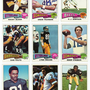Fresh 1975 Topps Football complete set of (528) cards. This crisp assembly generally presents in the (EX-MT to NM) range with several better! Highlights include: #12 Blount RC (NM), #39 Bleier RC (EX-MT), #65 Pearson RC (EX-MT), #145 Staubach (EX-MT), #282 Swann RC (EX-MT), #367 Fouts RC (NM), #380 Stabler (EX), #416 Theismann RC (NM), #451 Bradshaw (VG), #500 Simpson (EX-MT) and #524 Branch RC (EX-MT).