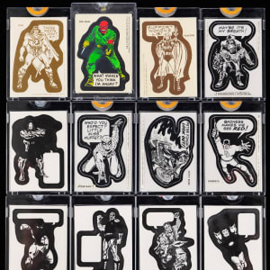Marvel Comics iconic super-heroes save this day, with this 1974-1976 Topps Vault Comic Book Heroes sticker collection (12). These original production art pieces are all one-of-a-kind originals, created for the highly popular mid-1970s Topps Comic Book Heroes three-year series. All (12) pieces are housed in pristine state, in holders sealed with Topps Vault stickers, and each comes with a Topps Vault COA. Featured are: Spider-Man 1, Spider-Man 2, Deathlok, Doctor Doom, Valkyrie, Daredevil, Iron Man, Red Skull, Sgt. Fury, Ghost Rider, Kull, and Frankenstein's Monster.