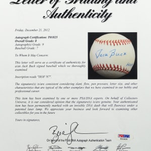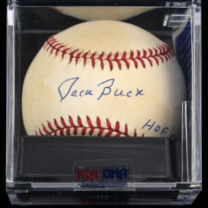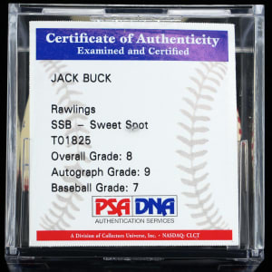 Let some of your bucks stop here, for this Jack Buck single-signed baseball. Buck's credits include membership in a great many halls of fame, and he pointed out a treasured recognition, by including the inscription "HOF 87" with his sweet spot signature on this ONL/Coleman baseball. This inscription is a reference to his Ford C. Frick award from the Baseball Hall of Fame. Buck's other honors include enshrinement in the Pro Football Hall of Fame, the Missouri Sports Hall of Fame, the National Radio Hall of Fame, the St. Louis Cardinals Hall of Fame, and others. There's also a statue of Buck located outside Busch Stadium, and a section of highway in St. Louis is named after him. PSA/DNA has provided the following grades: Autograph ("9"), Baseball ("7"), Overall ("8").