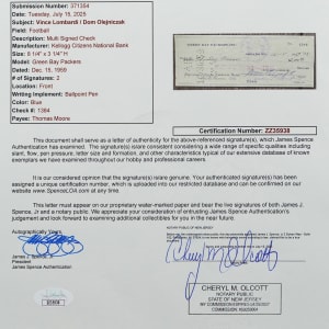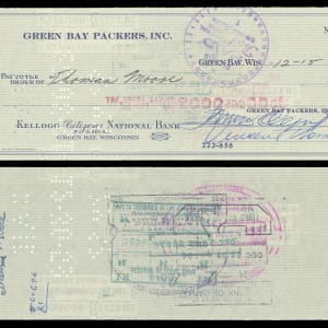 Green Bay Packers legend Vince Lombardi had just finished his first season as an NFL head coach two days earlier, when he signed the offered check on December 15, 1959. Lombardi was hired to reverse the fortunes of the Green Bay franchise starting with the 1959 season, in the dual roles of head coach and general manager. It was in his capacity as GM that he signed this Green Bay Packers team check, which is made to running back Thomas Moore. Lombardi selected Moore 5th overall in the 1960 NFL Draft, which was held in-season, on November 30, 1959 at the Warwick Hotel in Philadelphia, while Lombardi still had two games to play during his NFL rookie season as a head coach. Drawn on the Kellogg Citizens National Bank of Green Bay, this check is also signed by Packers president Dominic Olejniczak on the front, and by payee Moore on the back. All three signatures are distinct examples, and the check presents handsomely.