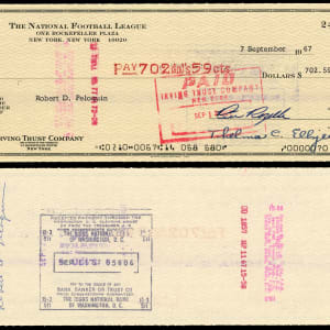 NFL head honcho Pete Rozelle's thirty years of running the league earned him a spot in the Hall of Fame. This Rozelle boldly signed check is looking to earn a spot in your collection. Major events were transpiring in the world of pro football at the time this National Football League check #2443 was made to attorney Robert D. Peloquin, on 9/7/67. Peloquin had joined the NFL Commissioner's office as Associate House Counsel in 1967, while Rozelle was overseeing the NFL's merger with the AFL. At the same time, both the NFL and AFL were adding expansion teams. Throughout the 1960s, Rozelle was raising the NFL's profile, and his successful pitch to sell Monday night games to ABC in 1970, paved the way to football becoming the biggest game in American sports. Rozelle's firm signature on the customary endorsement line of this check is fully satisfying, and the check remains crisp and clean.