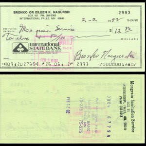Even the name "Bronko" Nagurski sounds tough. They already had "The Monster" position for a roving defensive tackle when Nagurski played for the Chicago Bears way back in the 1930s. Perhaps they should have had the position "Destroyer Back" to describe his offensive ball carrying skills, as he made a habit of destroying opposing defenders, on his way to gridiron glory. Add a monster Hall of Famer signature to your collection, with this Nagurski signed personal. Dated 2/2/82, this International State Bank check proudly hosts a potent Nagurski endorsement. The last two letters of Nagurski's surname show minor ink migration, likely from long ago moisture contact, otherwise the prized signature presents firmly.