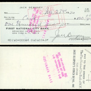 Floor the competition, and declare yourself champion of this Jack Dempsey signed personal check. Known as "The Manassa Mauler" for his punishing boxing style, Dempsey recorded 53 knockouts in his 84 professional bouts. Here he has delivered a knockout with the pen, applying a potent signature to the front of this crisp First National City Bank check, dated 11/23/70.