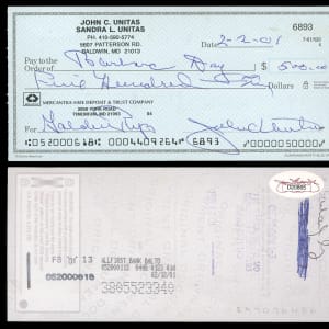 The quarterback with "the Golden Arm" proved golden with the pen as well, as evidenced by this Johnny Unitas signed check. Dated 2/2/01, this personal check was signed by Unitas approxiamtely fifteen months before his passing in May of 2002. The Hall of Fame quarterback's signature is about as tight as one of his legendary spirals, and the check is crisp and clean.
