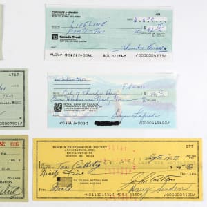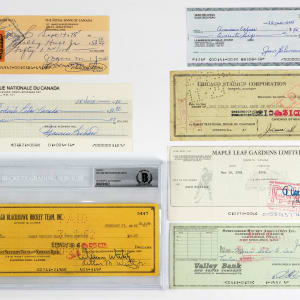 Skate away with a nice haul of Hockey legends when you put the winning bid in the net for this collection of 13 signed checks. Dating from 1938-2006, this frosty cool selection is blessed with solid signatures throughout. Nearly all of the subjects are Hall of Famers, with both superstar players and high profile executives noted.