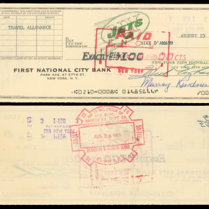 Hall of Fame coach "Weeb" Ewbank paid big dividends for many teams, at many levels. He also paid the bills while employed by the New York Jets, including this signed check made to defensive back Mike D'Amato. As an assistant coach with the Cleveland Browns from 1949-1953, Ewbank was a member of AAFC and NFL championship squads. The winning continued during his career as a head coach, when he led the Baltimore Colts to back-to-back NFL championships in 1958 and 1959. A decade later, he was at the helm of the New York Jets when the they won the 1968 AFL championship, and Super Bowl III. Ewbank also put dominant winning percentages on his resume at the high school and college levels, and he even coached a U.S. Navy military team with Paul Brown during WWII. D'Amato was on the Jets Super Bowl champion team, in his one and only season as a pro football player. Ewbank has signed on the front of the offered 8/23/69 Jets payroll check, which was made to D'Amato for a "Travel Allowance" in the amount of $100. D'Amato has endorsed the check on the back, and both his and Ewbank's signatures are pleasing examples.