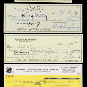 Joseph Keyshawn Johnson 6/1/96, C.D. Shaughnessy 6/6/61, Derrick Thomas 1/10/95, Dave Robinson (signed front and back) 3/4/75, Bobby Beathard (San Diego Chargers payroll check to Cedric Bank) 5/26/92, W.J. Gudie 8/8/57, Bob Skoronski 1/4/82, Pepper Johnson 12/13/97, Dr. Leslie Horvath 6/4/85, Richard F, Szymanski 11/17/98, Billy Pricer 12/21/93, Ollie Cline 6/3/89, Ron Kostelnik 1/4/66, Horace Gillom 12/28/83.